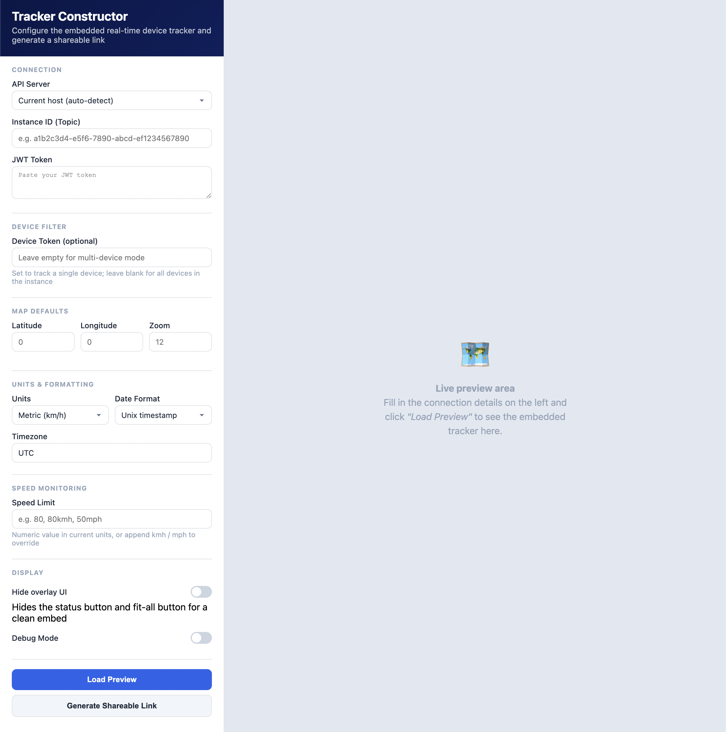 The Tracker Constructor is a visual configuration tool that helps developers build and preview embedded tracking widgets. Instead of manually assembling URL parameters, you use a form-based interface to configure every aspect of the tracker, see a live preview, and generate a ready-to-use URL — all without writing code.