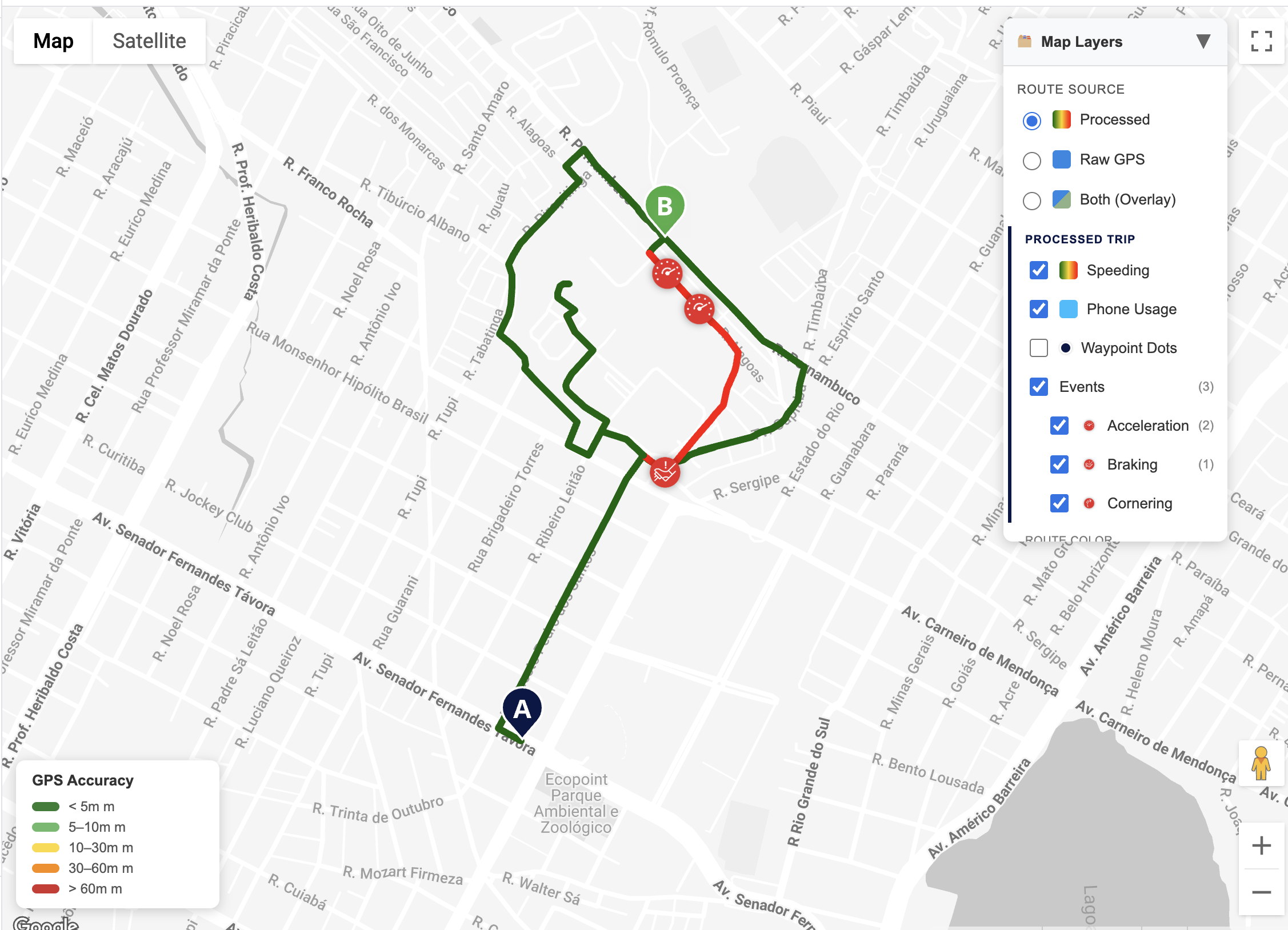 - Processed trip route — server-calculated path with speed and phone usage segments color-coded directly on the polyline